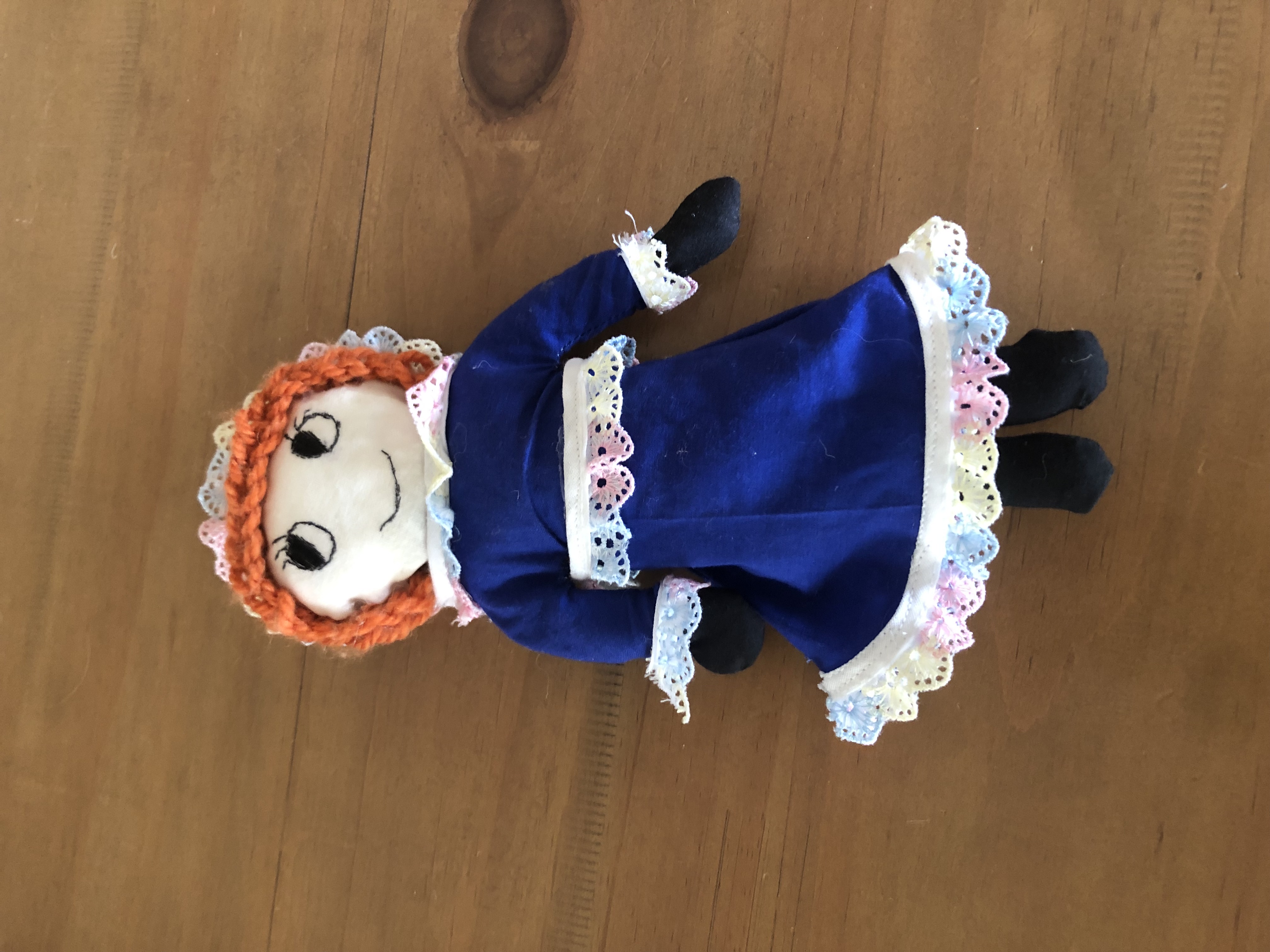 I started making the doll by cutting out two pieces of the body and sewing them together. After I made the head, I sewed the dress, hot glueing it on in some places. I crocheted the hair and hot glued it as well (I think hot glue is a crafter’s best friend).